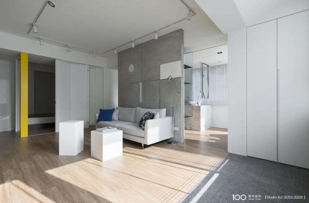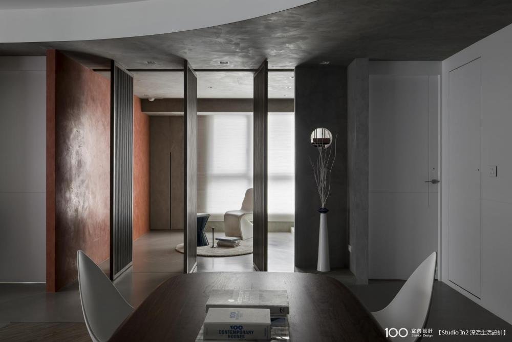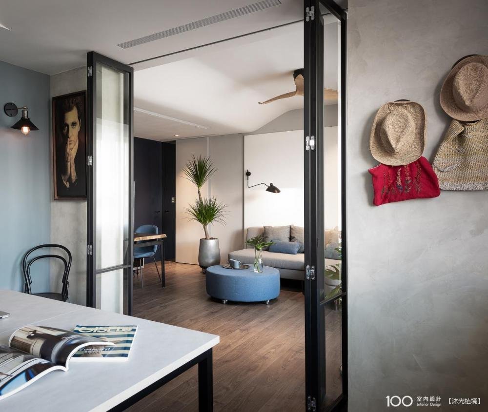 電視牆後方作為屋主的工作室,因為只有單面採光,特別使用鐵框玻璃摺疊門,即使關門也能引出房內光線,而當門扇全部打開時則使空間更顯寬敞明亮。