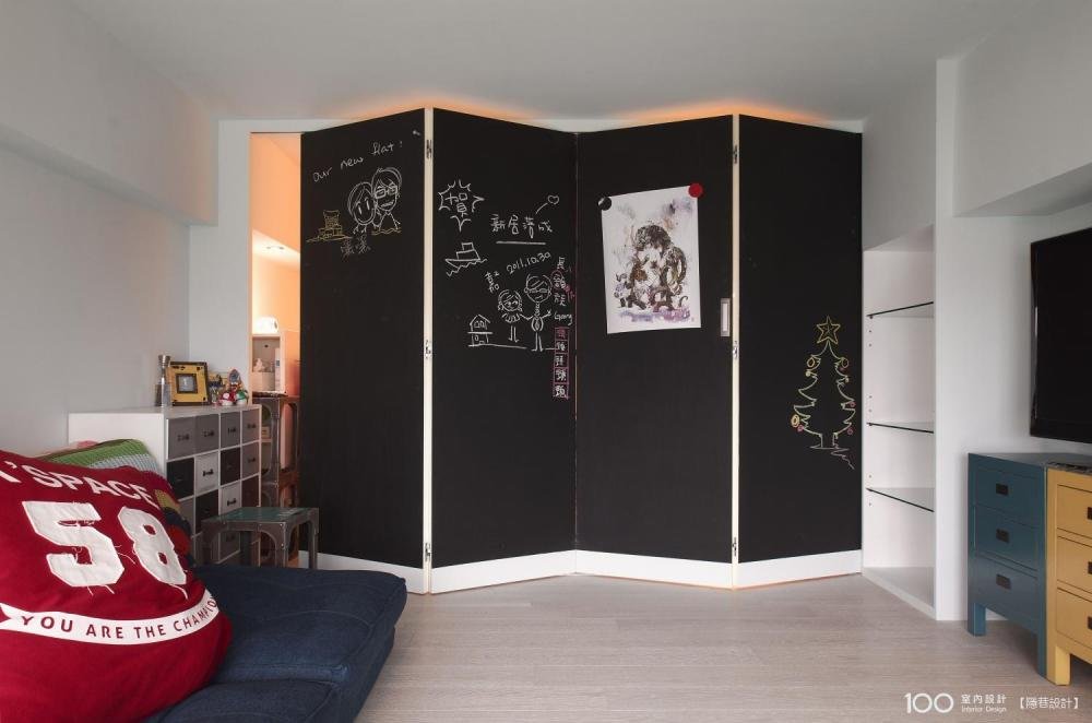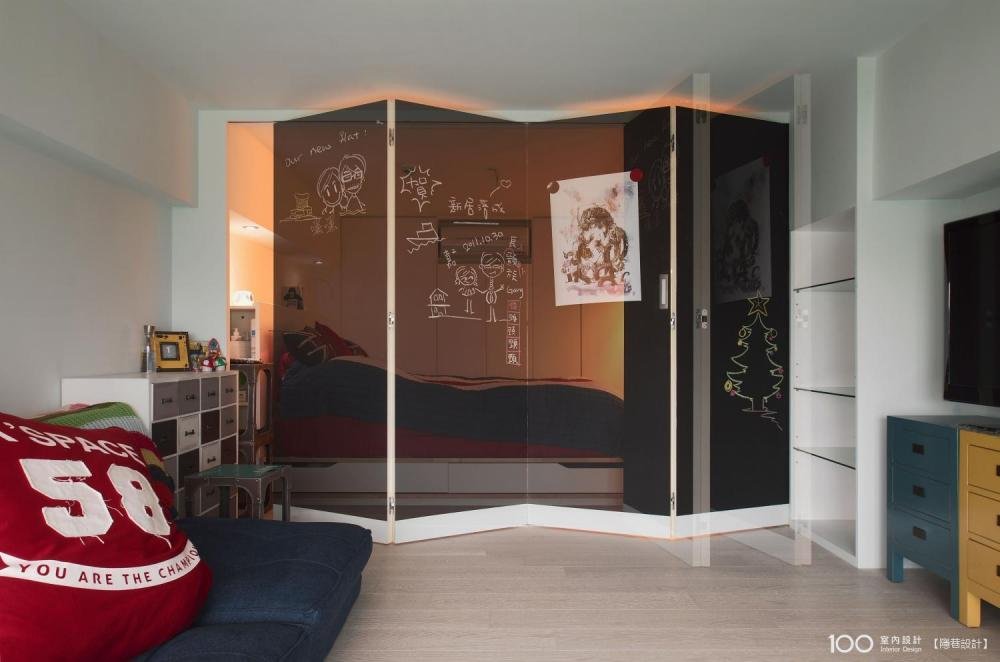 這間15坪的挑高住宅,一樓是工作空間,二樓則是客廳兼客房、主臥室,為求起居隱私部分,以摺疊門的形式界定臥室與客廳區域,並運用雙層摺疊門,一層為黑玻能隔音但不阻擋光線,另一層為黑板漆鋪陳門片充分遮蔽,也使創作無所不在。