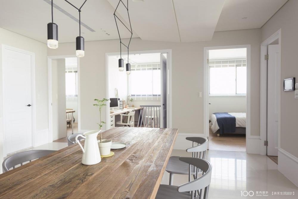 此案的書房規劃因應屋主需求將一間房規劃為書房,除了配備以雙桌位與書牆來滿足機能需求,特別將門片改以摺疊拉門,避免餐廳區多扇制式門片的呆板感,而且平日可打開來提升餐區採光。